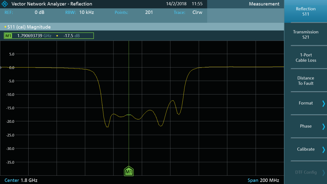 Благодаря встроенному КСВН-мосту, в сочетании с программной опцией R&S FPC-K42, анализатор спектра R&S FPC1500 может отобразить характеристики однопортовых цепей (двухполюсников). Поддерживается скалярное измерение коэффициента передачи S21 и векторный анализ коэффициента отражения S11. Это позволит инженерам измерять импенданс антенн или радиочастотных цепей по средствам диаграммы Смита. Также можно проводить измерения расстояния до места повреждения в ВЧ-кабеле.