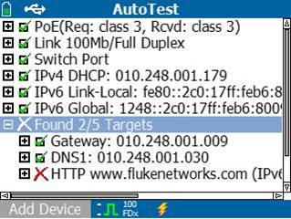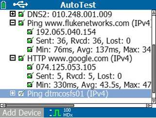 В дополнение к функции ping, которая может блокирываться, LinkRunner AT производит открытое испытание порта TCP, чтобы верифицировать подключение приложения через IPv4 и IPv6. Вы получите информацию о маршрутизаторе, серверах DNS и DHCP и времени их реакции. Сконфигурируйте 10 дополнительных устройств, чтобы удовлетворить ваши потребности при помощи URL или адреса IPv4/IPv6 и дополнительного номера порта приложения.