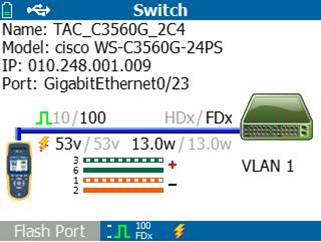 Подсоединив тестер в линию, используя медный или оптоволоконный (LRAT-2000) кабель, Вы увидите статус соединения, тип соединения и мощность сигнала. Затем LinkRunner AT используя протоколы IEEE Link Layer Discovery Protocol (LLDP), а также Cisco и Extreme Discovery Protocols (CDP и EDP) отобразит VLAN, модель ближайшего коммутатора, гнездо и порт: