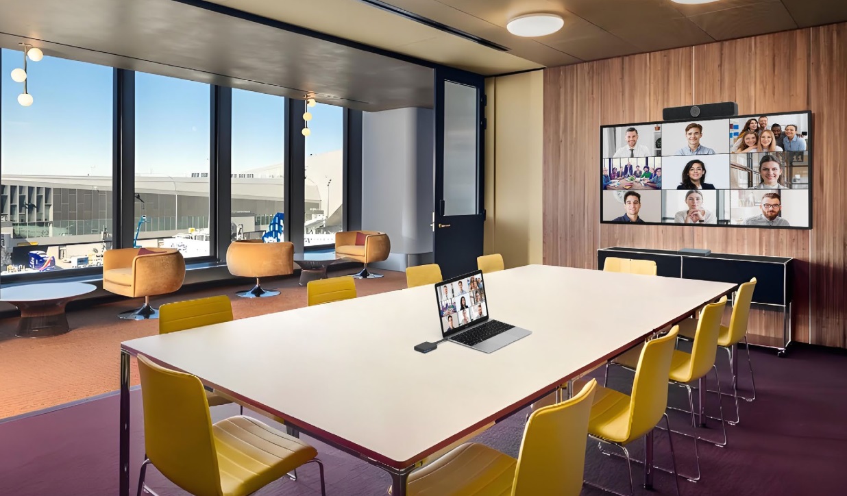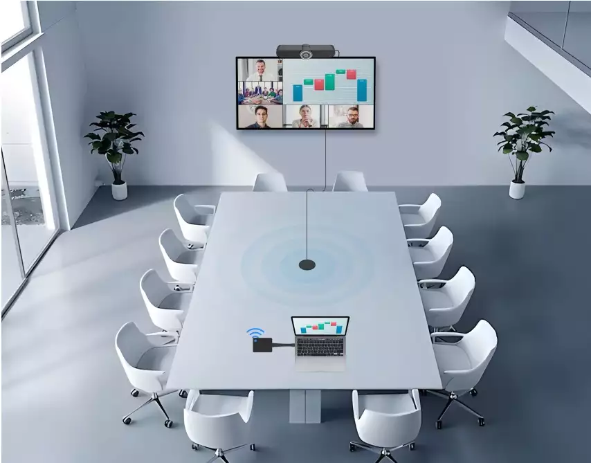 VoiceXpert VXV-530-BYOM - это решение BYOM для переговорных и конференц-комнат, позволяющее организовывать конференции и совещания без лишних проводов и подключений. Пользователь может управлять видеоконференцией с личного ноутбука, подключаясь к AV-оборудованию переговорной по беспроводной связи, что обеспечивает гибкость работы с любыми ВКС-платформами, удобство подключения и разнообразные сценарии проведения встречи.