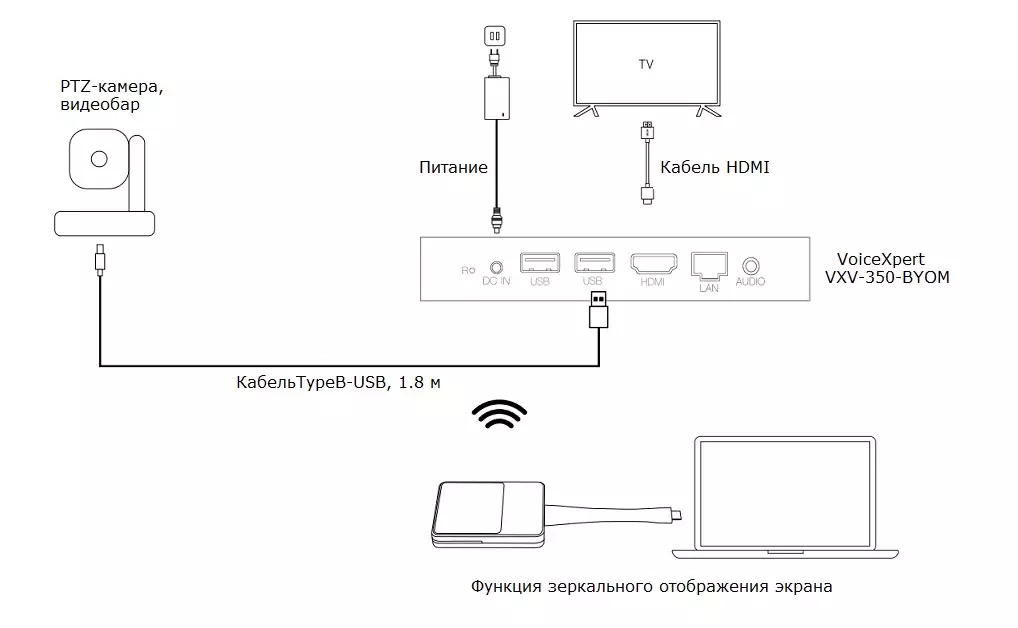 VXV-530-BYOM поставляется комплектом в который входит центральное устройство (хаб) и беспроводной USB-передатчик. К ЦУ подключаются все перефирийные устройства в переговорной: видеобары, PTZ-камеры, микрофоны, спикерфоны, видео-панели, телевизоры. Таким образом, хаб является точкой коммутации всего AV-оборудования, что позволяет сократить количество проводов в переговорной.
